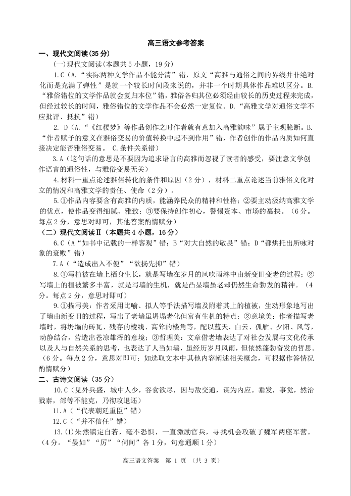 山东省潍坊市五县区2021.10高三年级阶段性监测语文答案