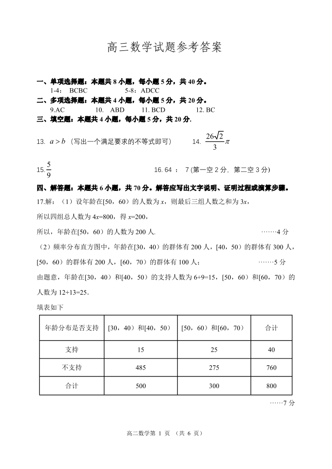 山东省潍坊市五县区2021.10高三年级阶段性监测数学答案