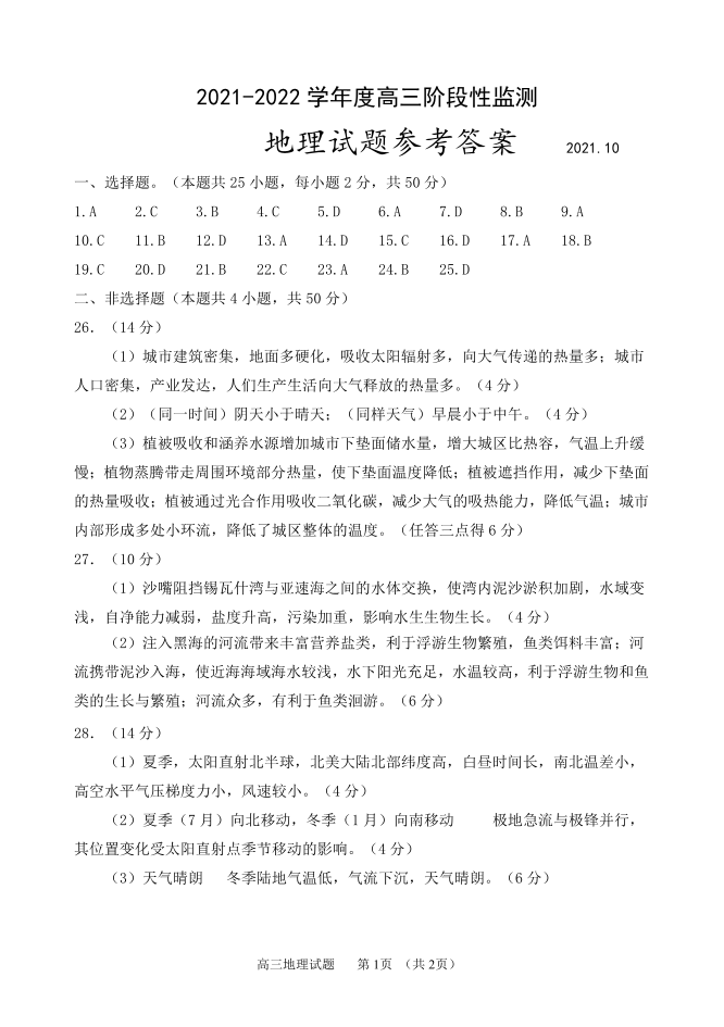 山东省潍坊市五县区2021.10高三年级阶段性监测地理答案