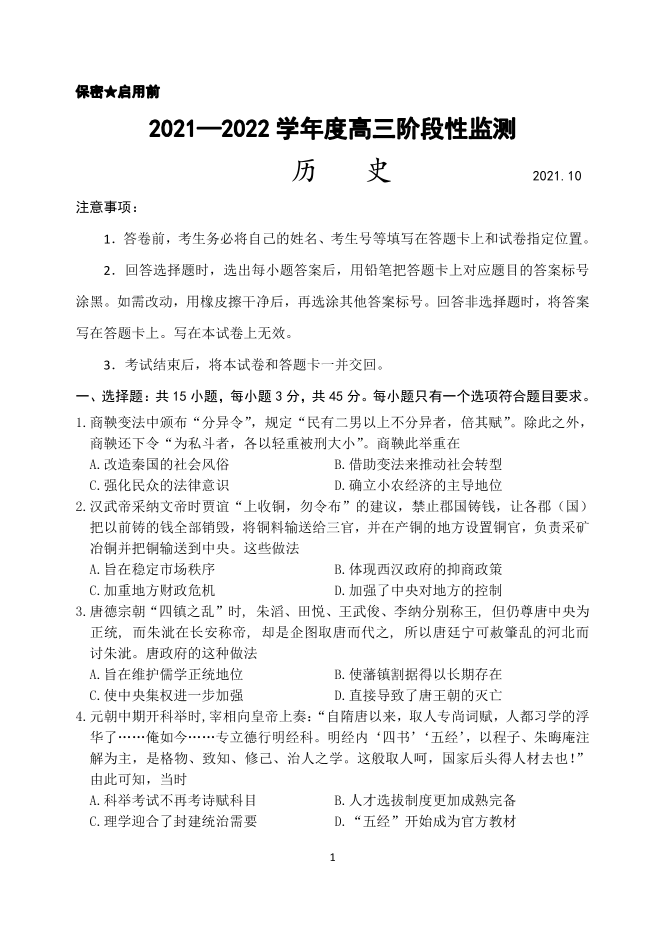 山东省潍坊市五县区2021.10高三年级阶段性监测历史