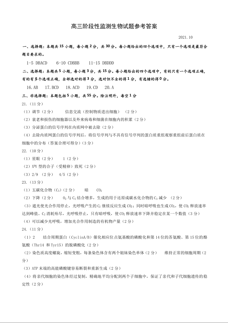 山东省潍坊市五县区2021.10高三年级阶段性监测生物答案
