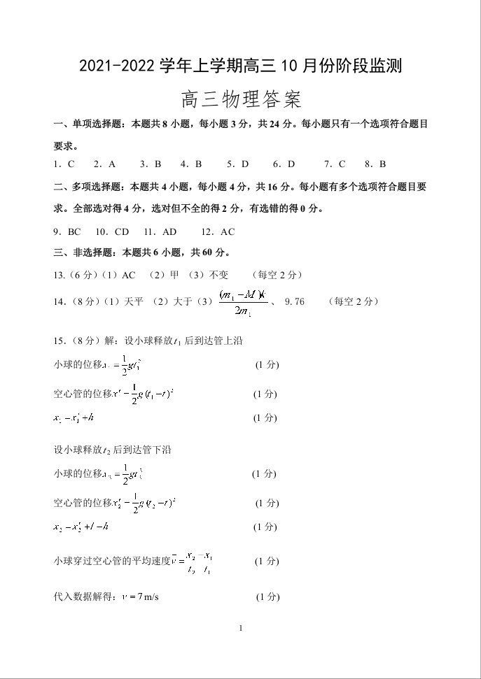 山东省潍坊市五县区2021.10高三年级阶段性监测物理答案