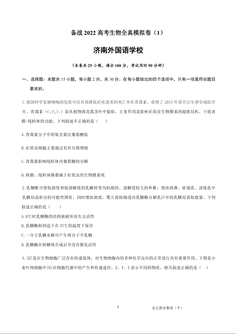 济南外国语学校2021.11高三年级模拟考试生物及答案