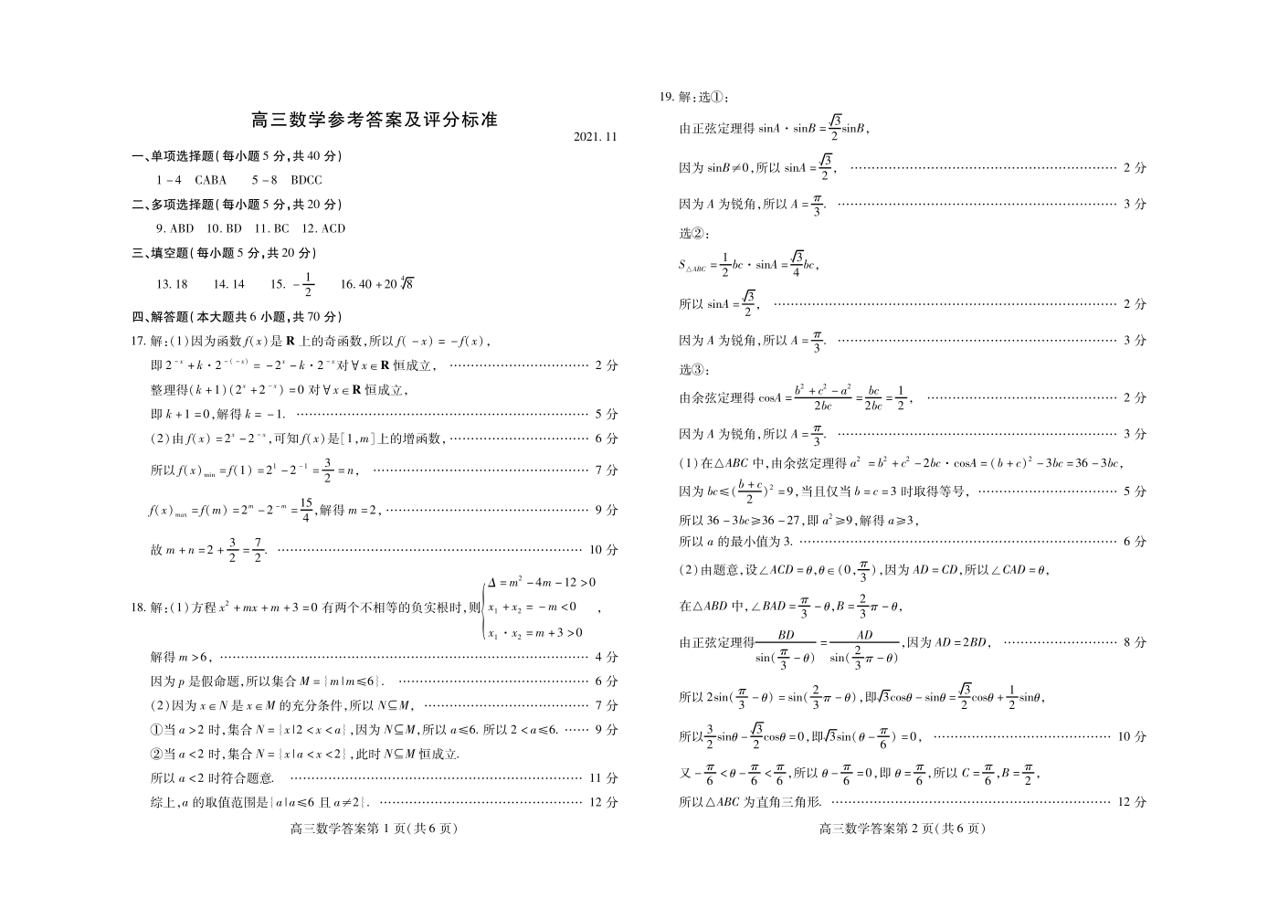 山东省潍坊市2021.11高三年级期中考试数学答案