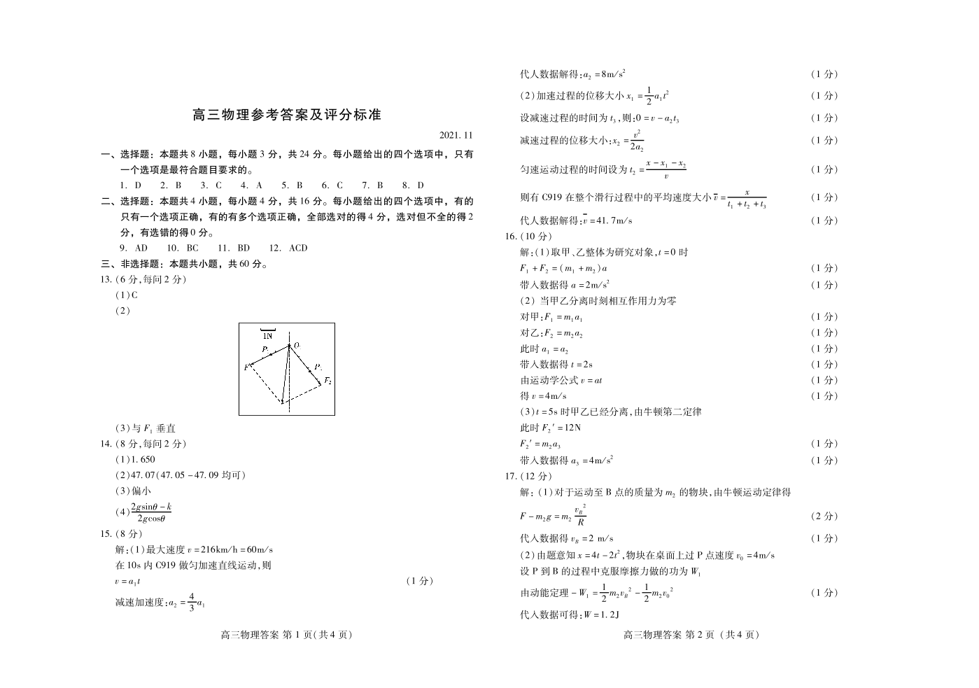 山东省潍坊市2021.11高三年级期中考试物理答案