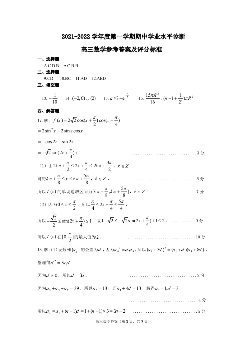 山东省烟台市2021.11高三年级期中考试数学答案