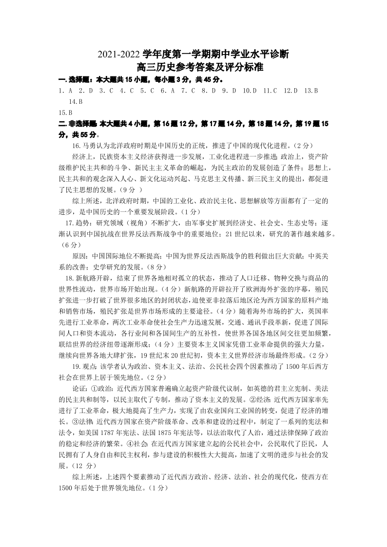 山东省烟台市2021.11高三年级期中考试历史答案