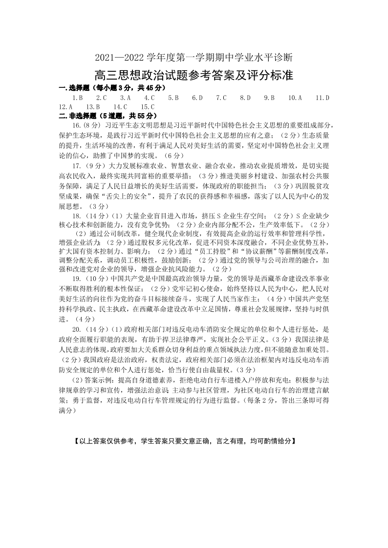 山东省烟台市2021.11高三年级期中考试政治答案