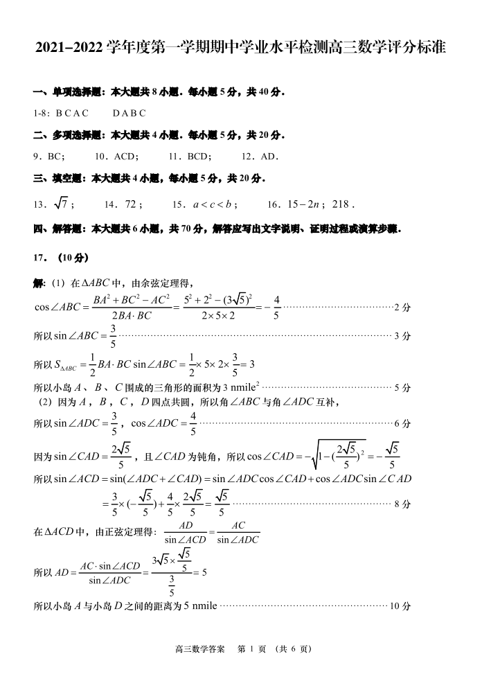 山东省青岛市区域2021.11高三年级期中考试数学答案