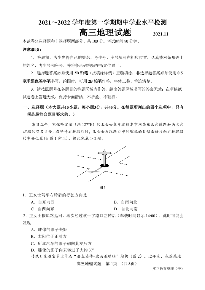 山东省青岛市区域2021.11高三年级期中考试地理