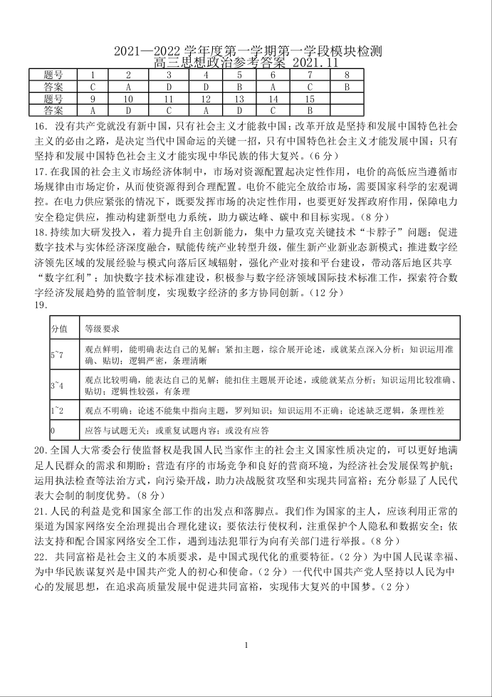 山东省青岛市区域2021.11高三年级期中考试政治答案