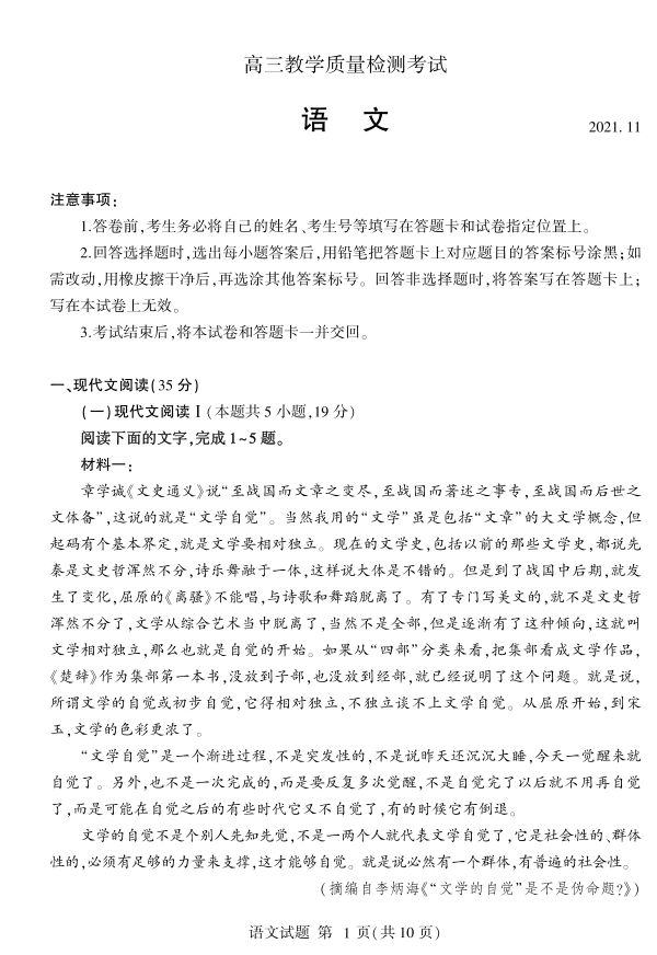山东省临沂市2021.11高三年级期中考试语文及答案