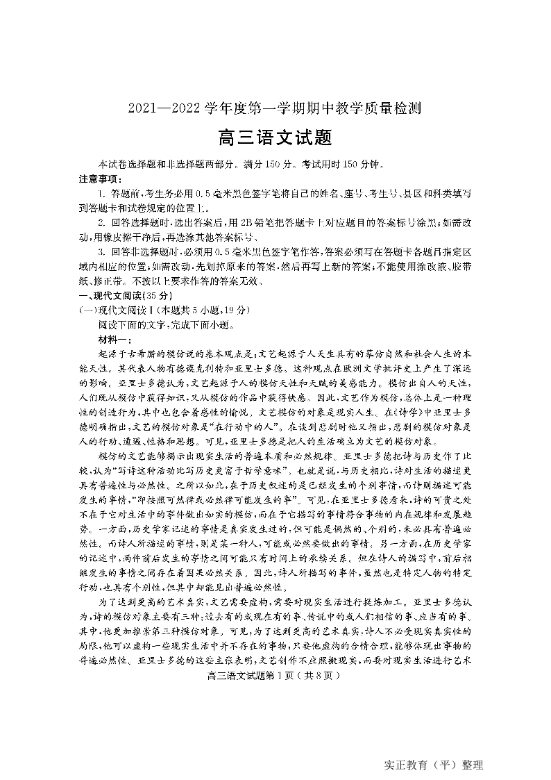 山东省聊城市部分区域2021.11高三年级期中考试语文及答案