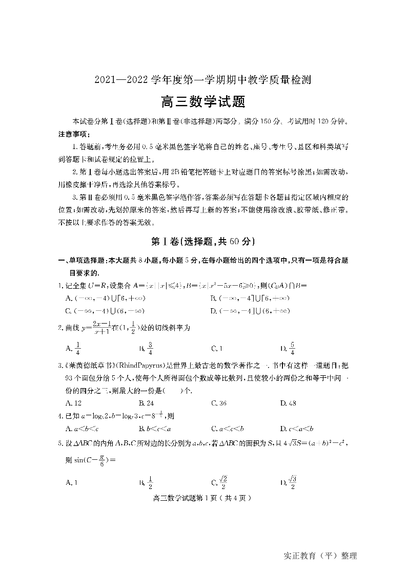 山东省聊城市部分区域2021.11高三年级期中考试数学及答案