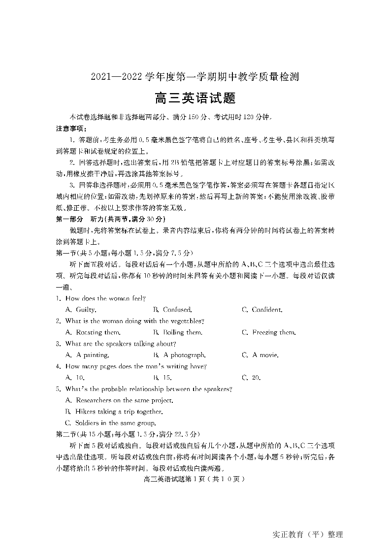 山东省聊城市部分区域2021.11高三年级期中考试英语及答案