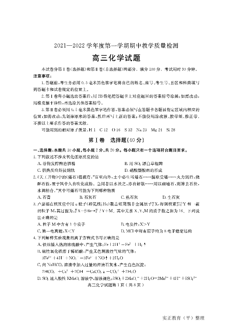 山东省聊城市部分区域2021.11高三年级期中考试化学及答案