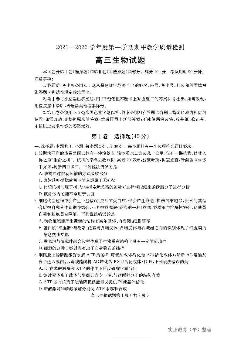 山东省聊城市部分区域2021.11高三年级期中考试生物及答案