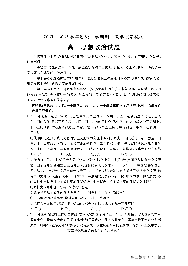 山东省聊城市部分区域2021.11高三年级期中考试政治及答案