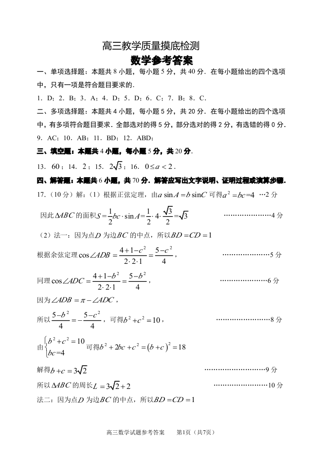山东省淄博市2021.12高三年级期末摸底考试数学答案