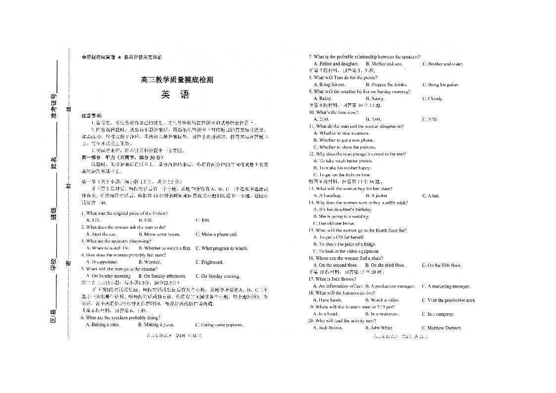 山东省淄博市2021.12高三年级期末摸底考试英语
