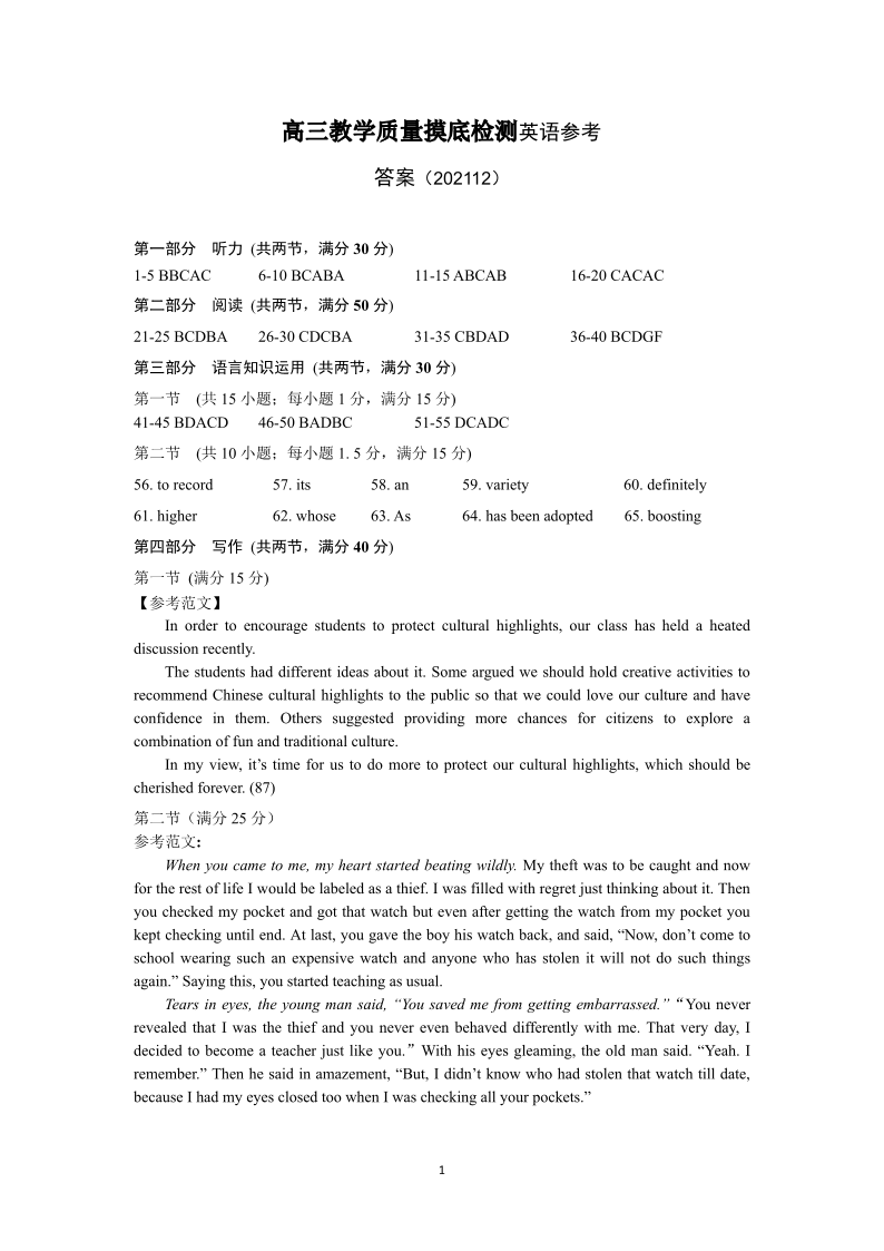 山东省淄博市2021.12高三年级期末摸底考试英语答案
