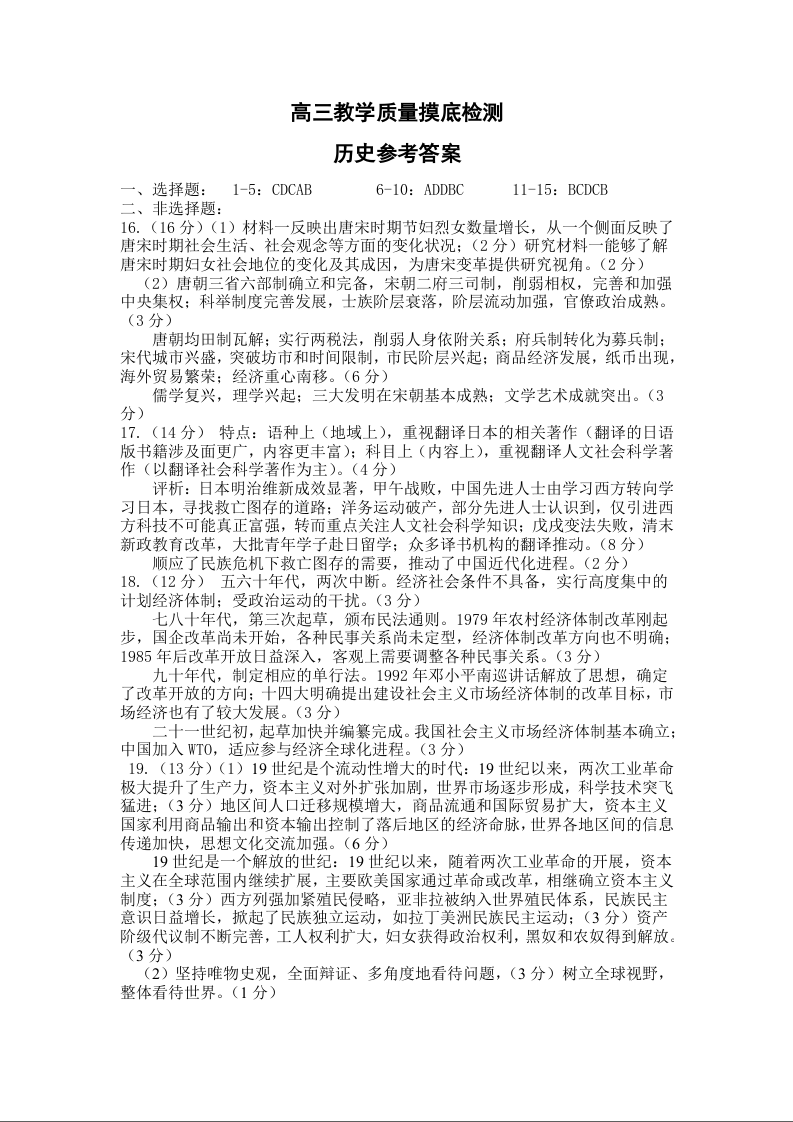 山东省淄博市2021.12高三年级期末摸底考试历史答案