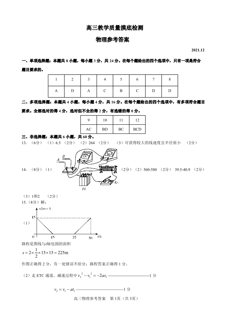 山东省淄博市2021.12高三年级期末摸底考试物理答案
