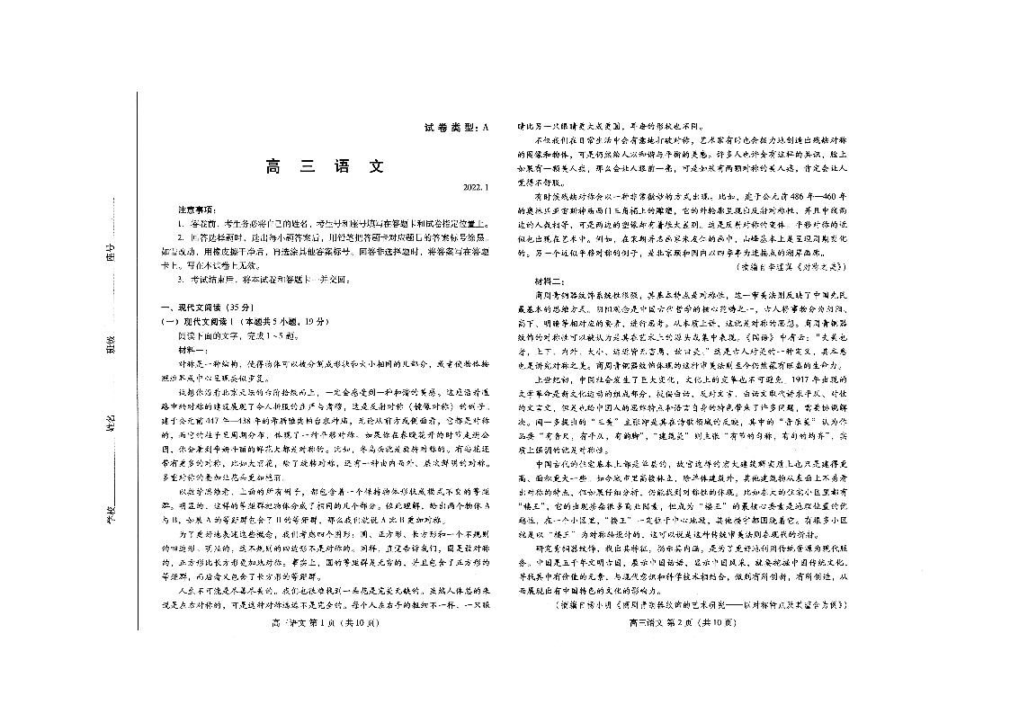 山东省潍坊市2022.1高三年级期末考试语文