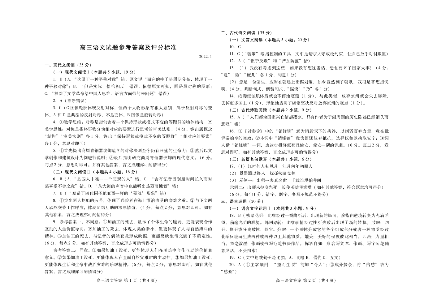 山东省潍坊市2022.1高三年级期末考试语文答案