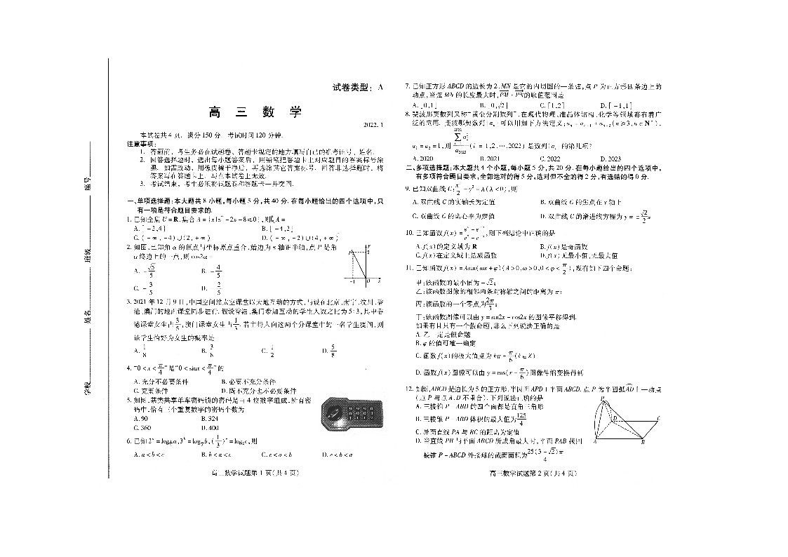 山东省潍坊市2022.1高三年级期末考试数学