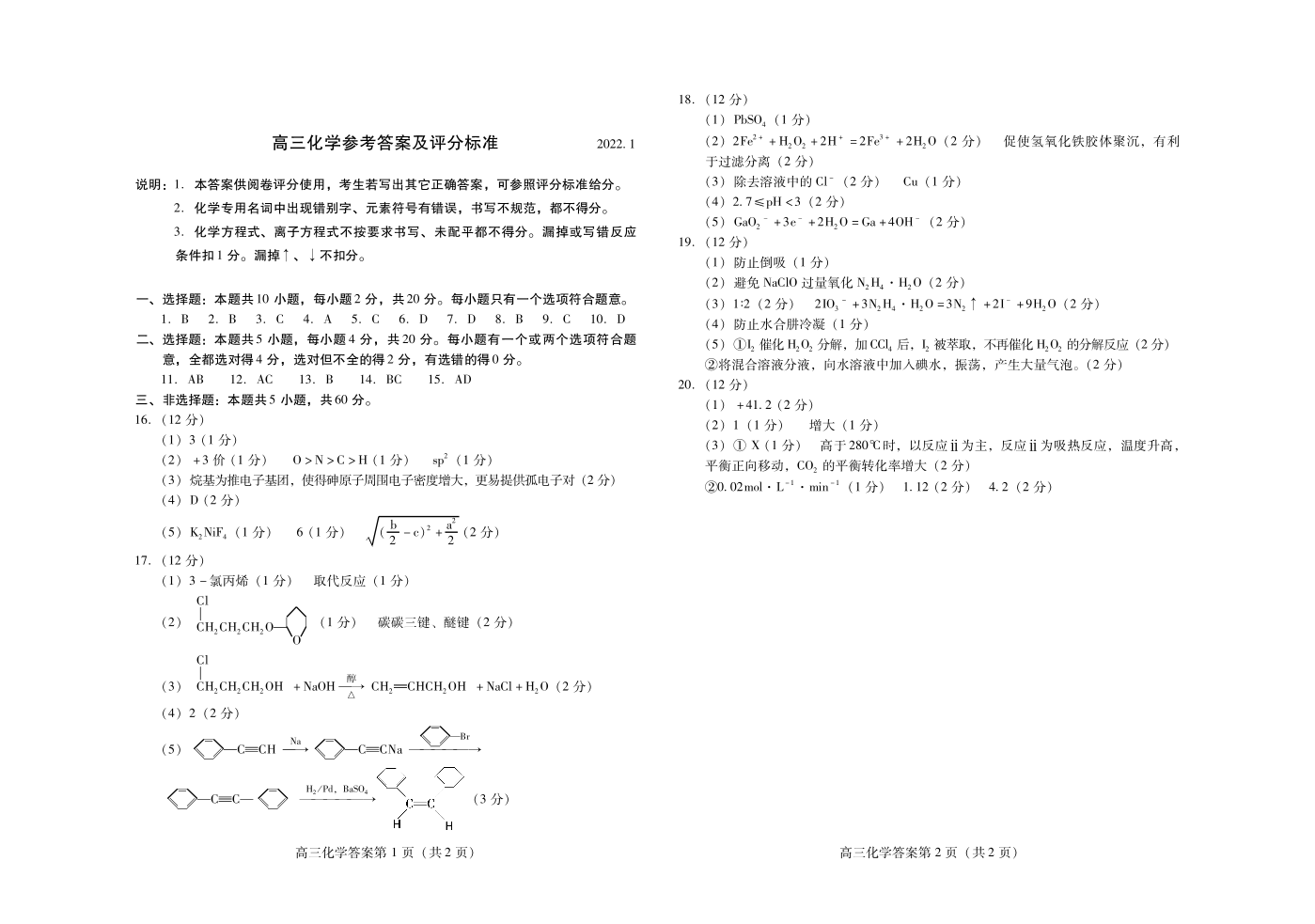 山东省潍坊市2022.1高三年级期末考试化学答案