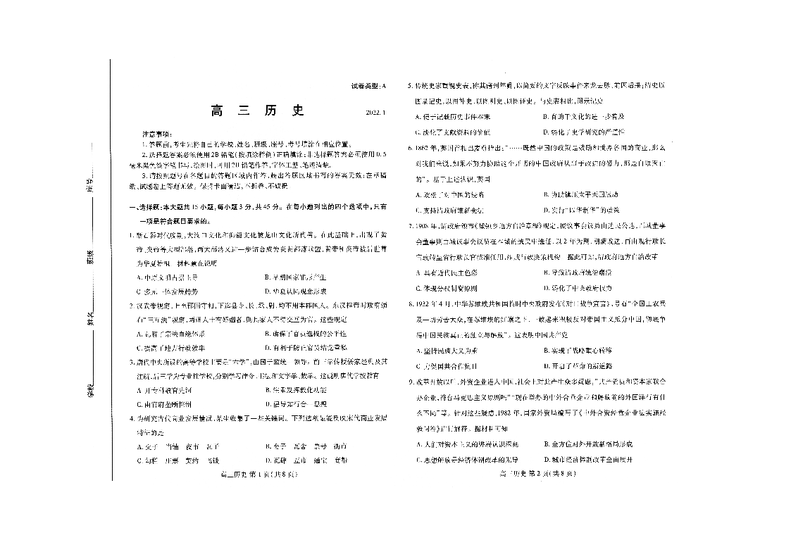 山东省潍坊市2022.1高三年级期末考试历史