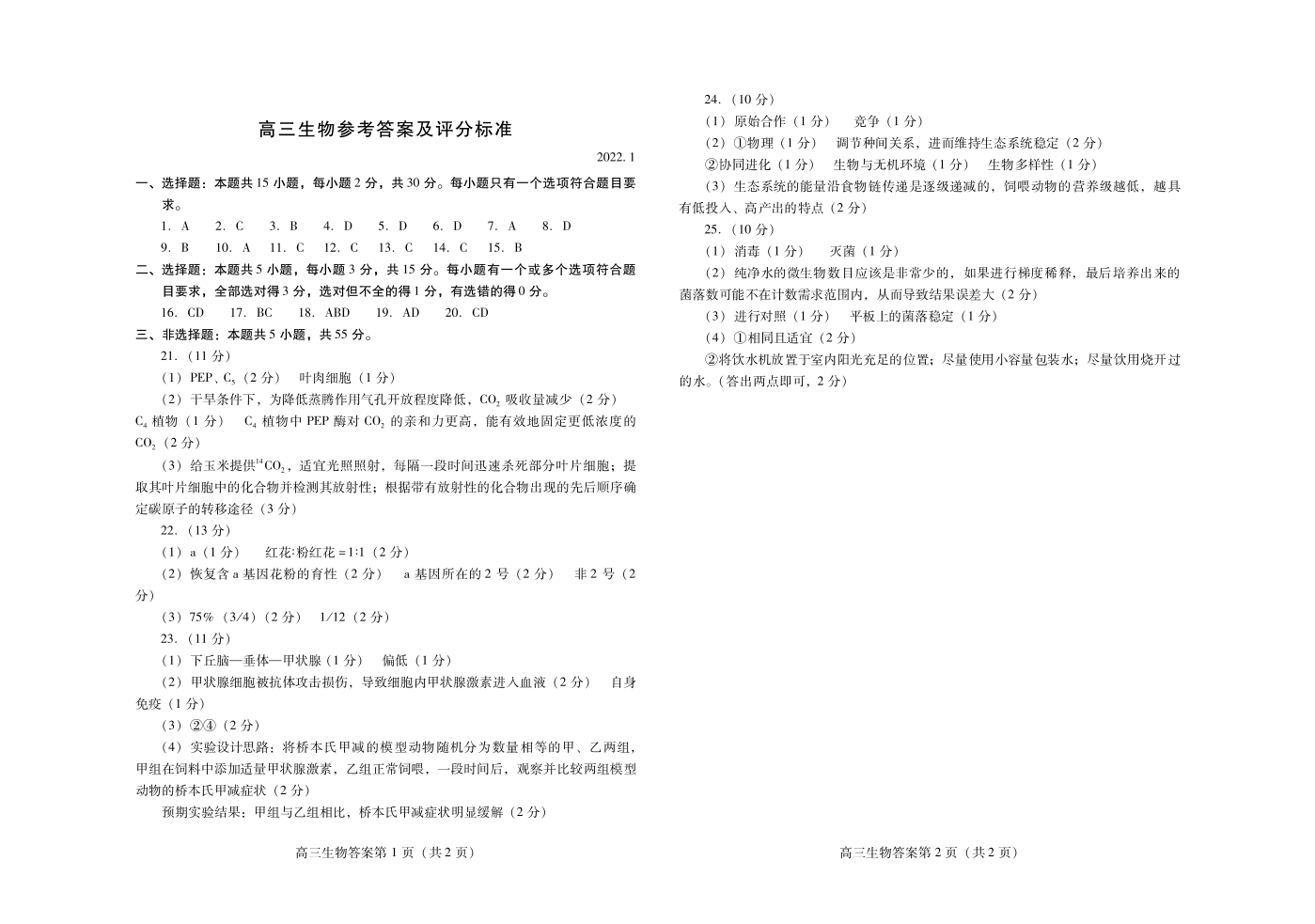 山东省潍坊市2022.1高三年级期末考试生物答案