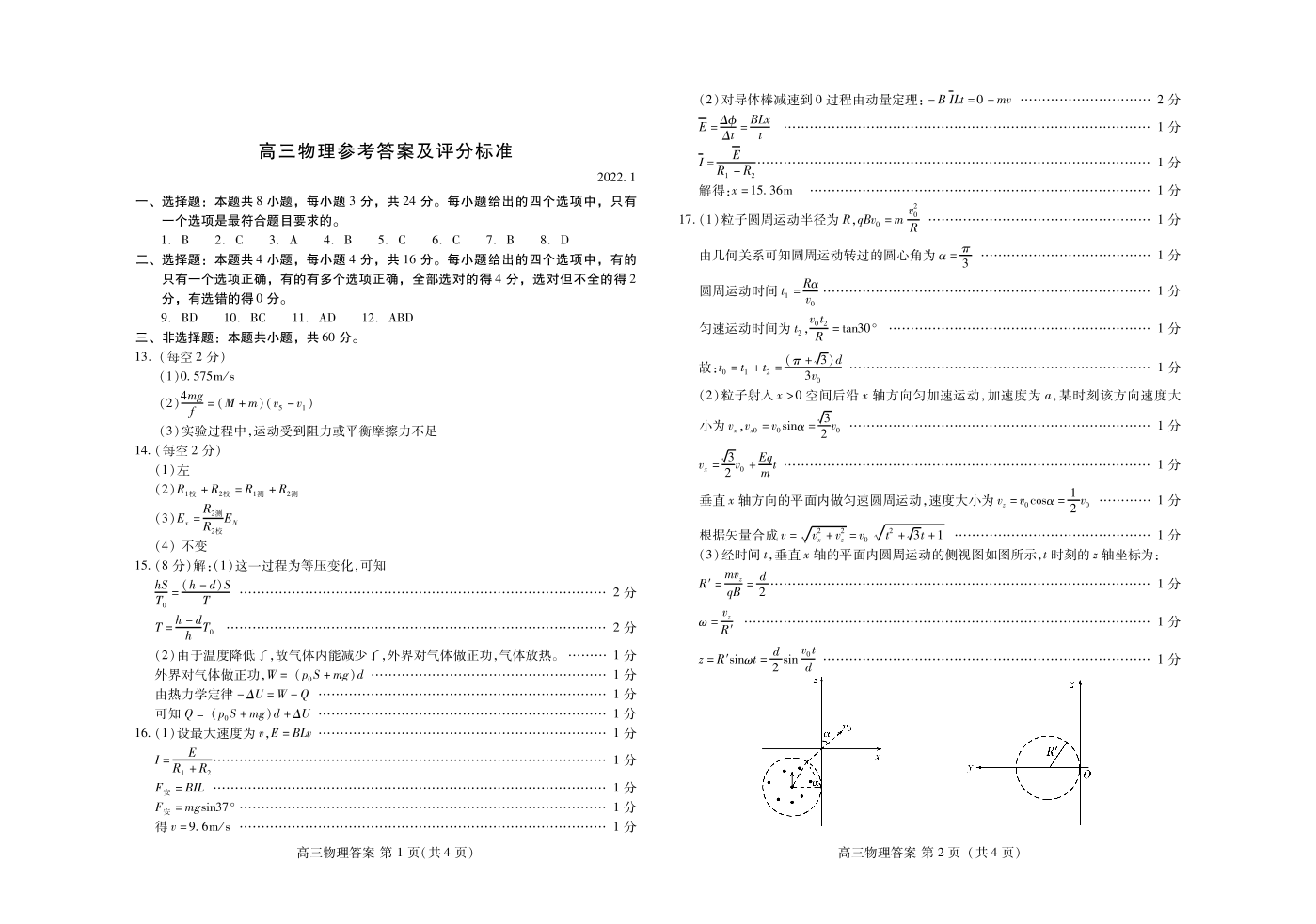 山东省潍坊市2022.1高三年级期末考试物理答案