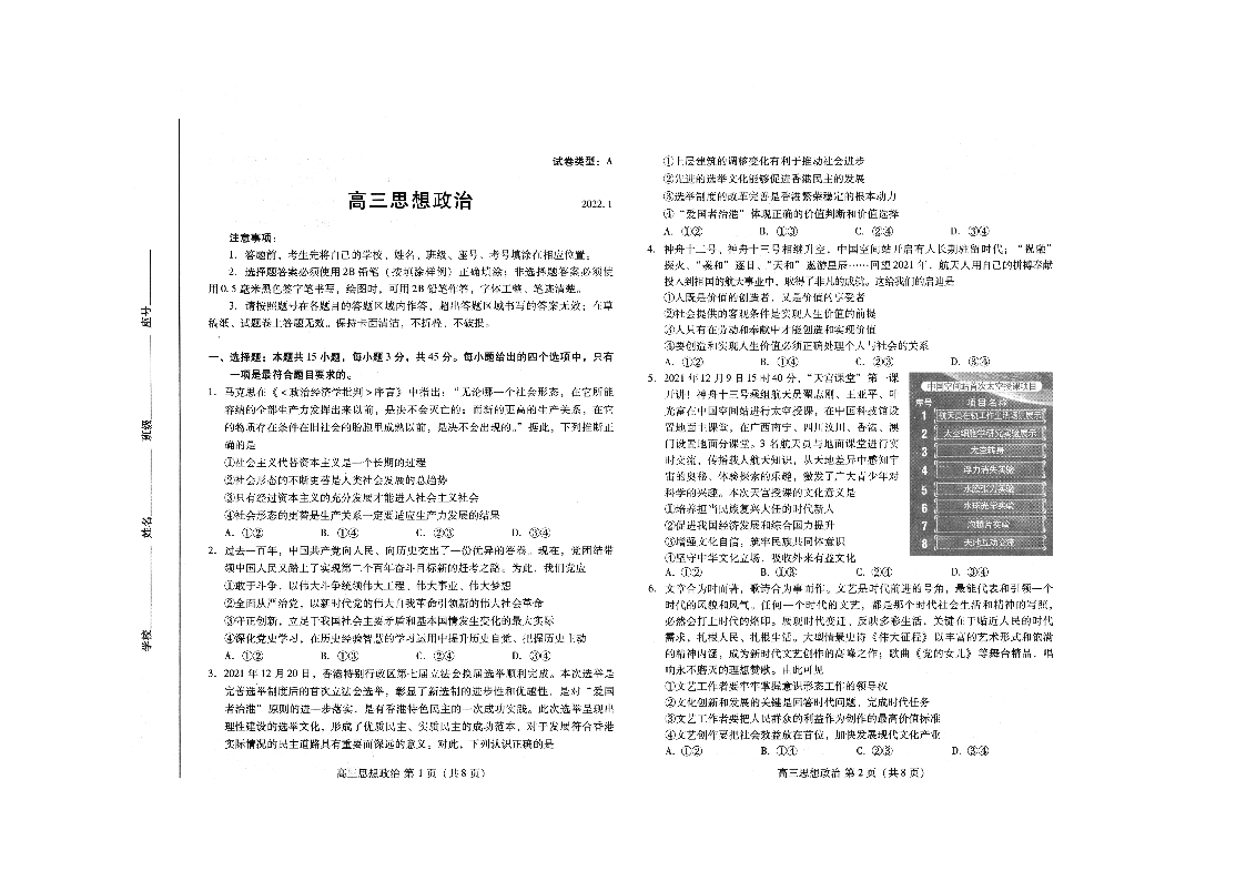 山东省潍坊市2022.1高三年级期末考试政治