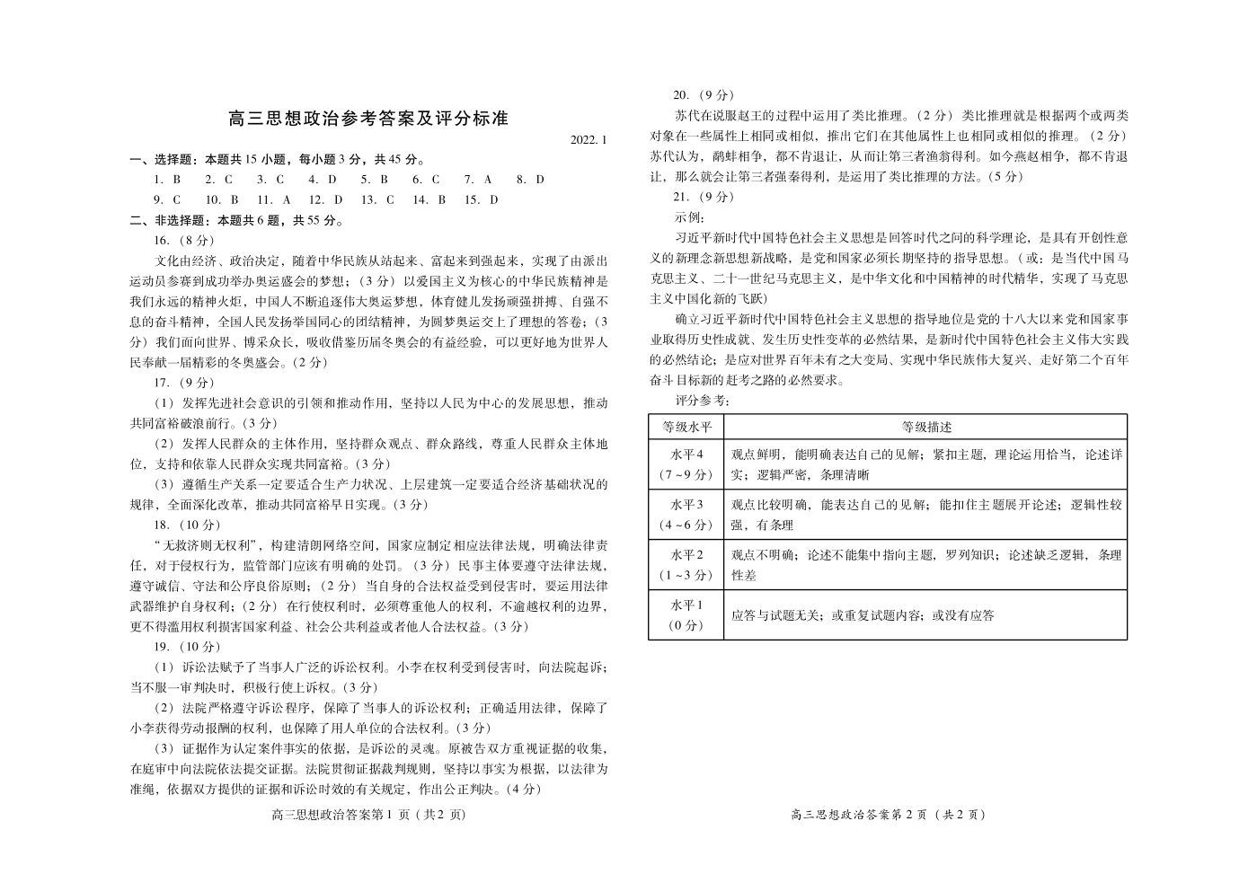 山东省潍坊市2022.1高三年级期末考试政治答案