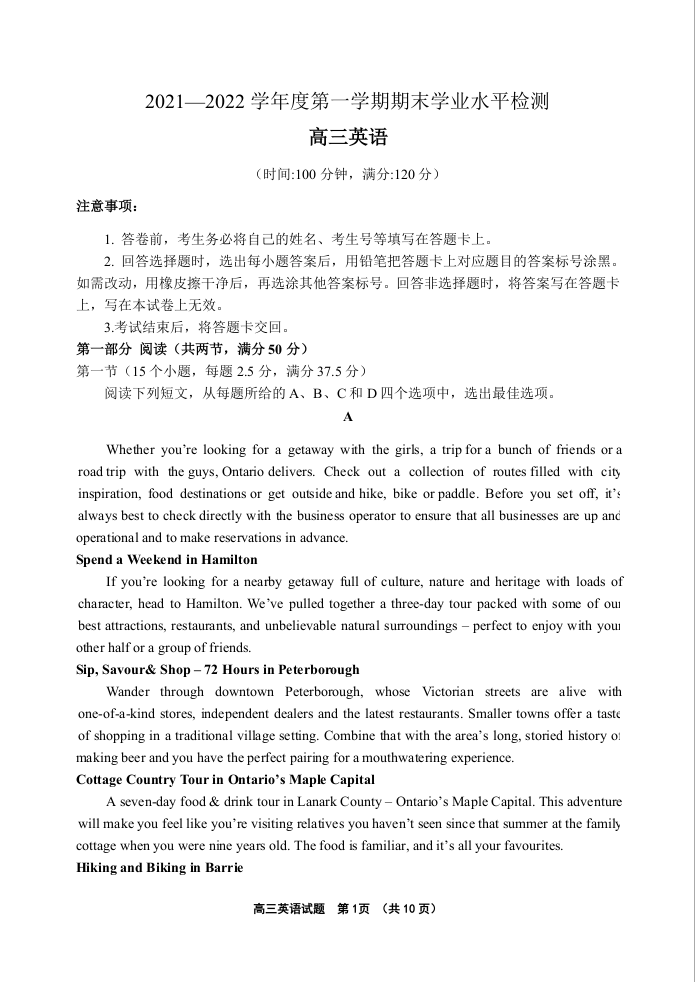 山东省青岛市2022.1高三年级期末学业水平检测英语