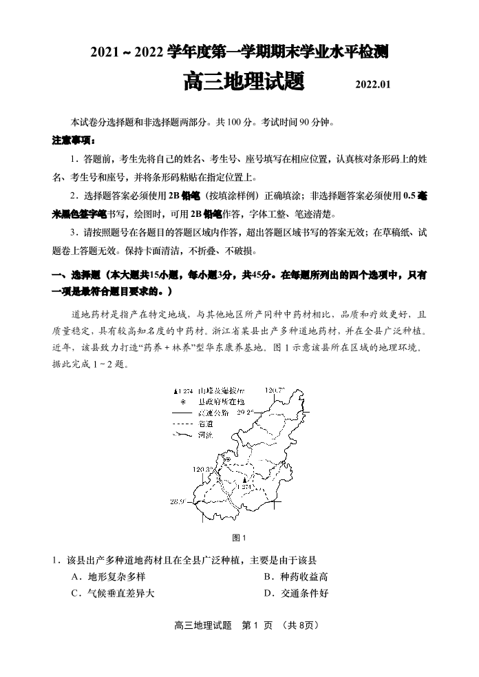 山东省青岛市2022.1高三年级期末学业水平检测地理