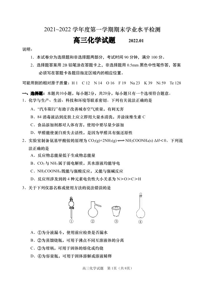 山东省青岛市2022.1高三年级期末学业水平检测化学