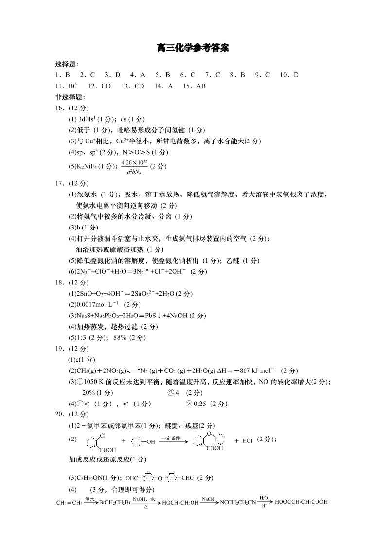 山东省青岛市2022.1高三年级期末学业水平检测化学答案