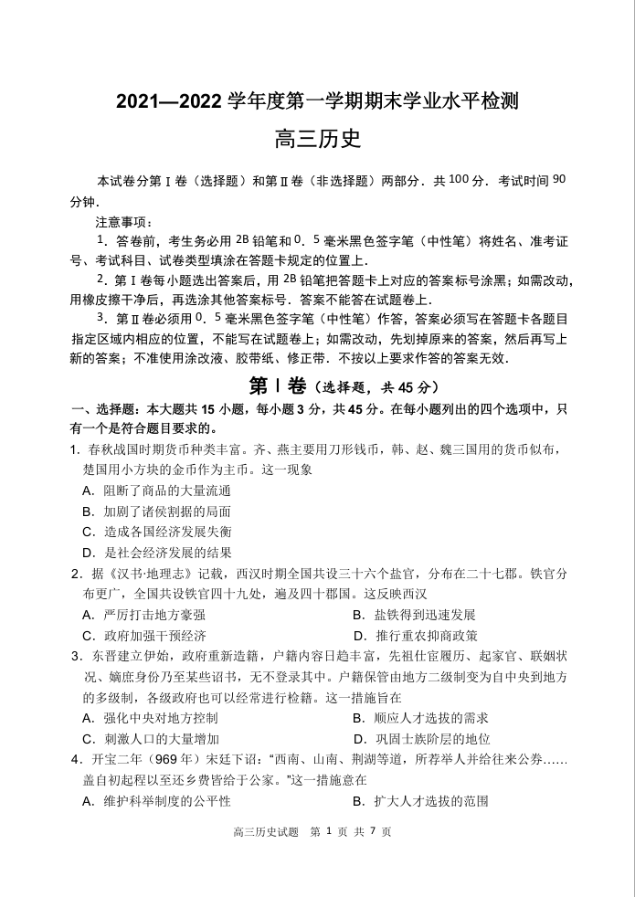 山东省青岛市2022.1高三年级期末学业水平检测历史