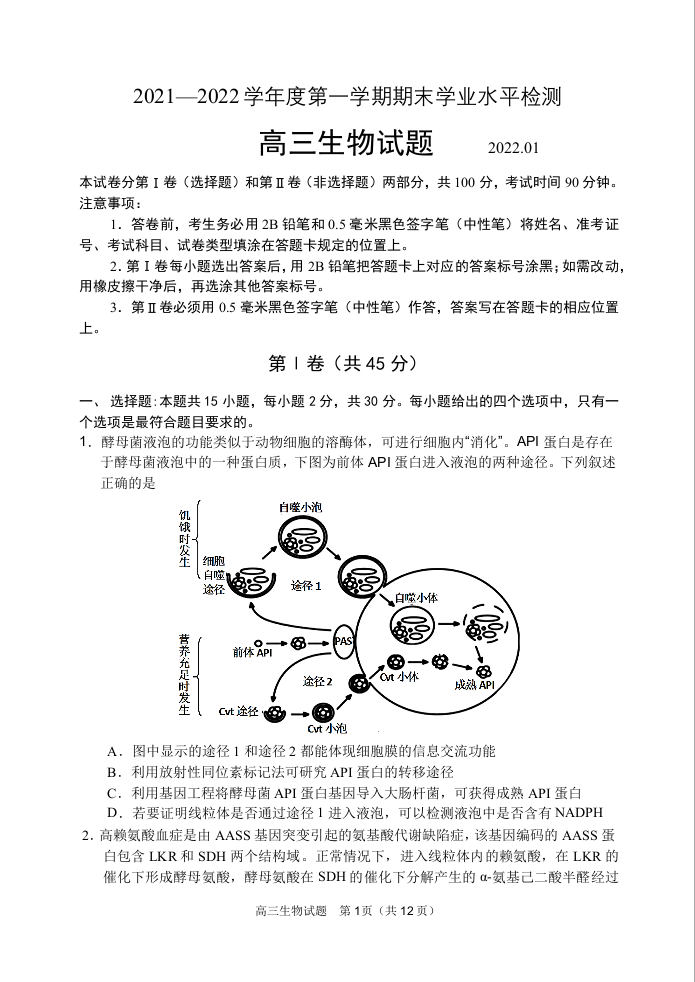 山东省青岛市2022.1高三年级期末学业水平检测生物