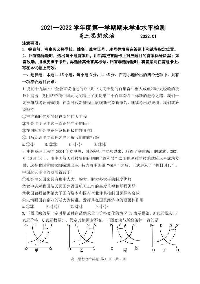 山东省青岛市2022.1高三年级期末学业水平检测政治