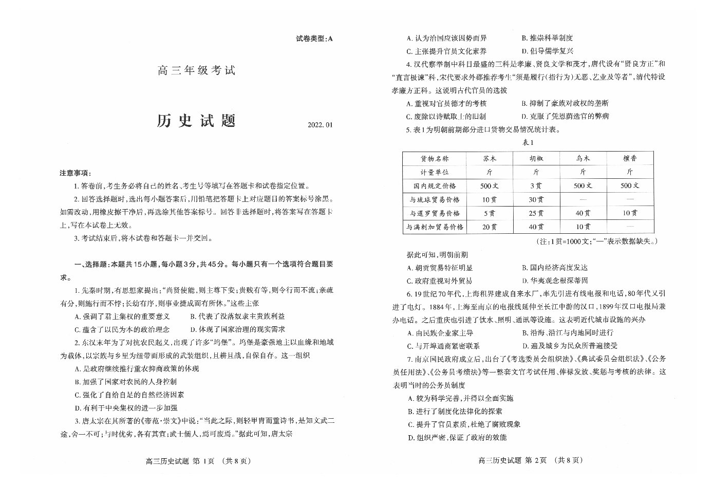 山东省泰安市2022.1高三年级期末考试历史