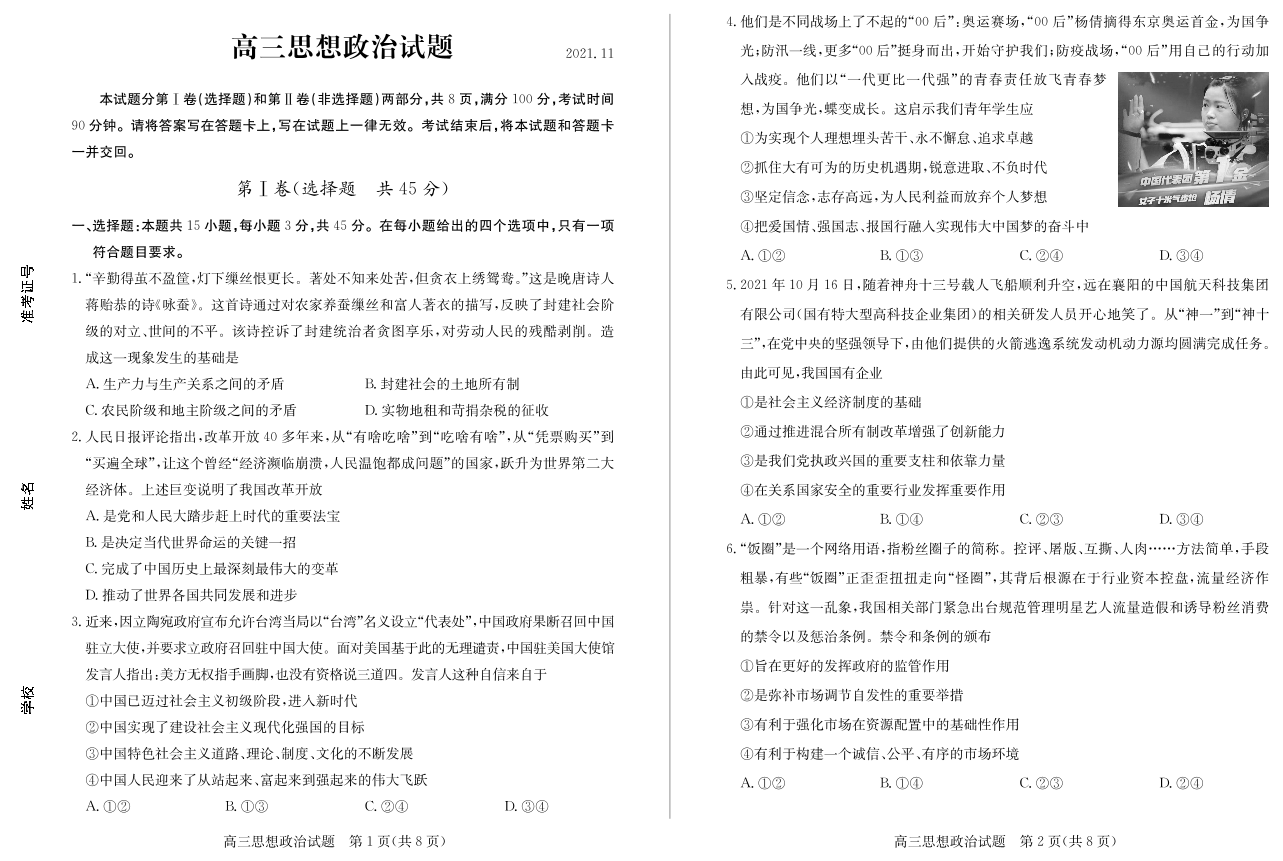 山东省德州市2021.11高三年级期中考试政治及答案