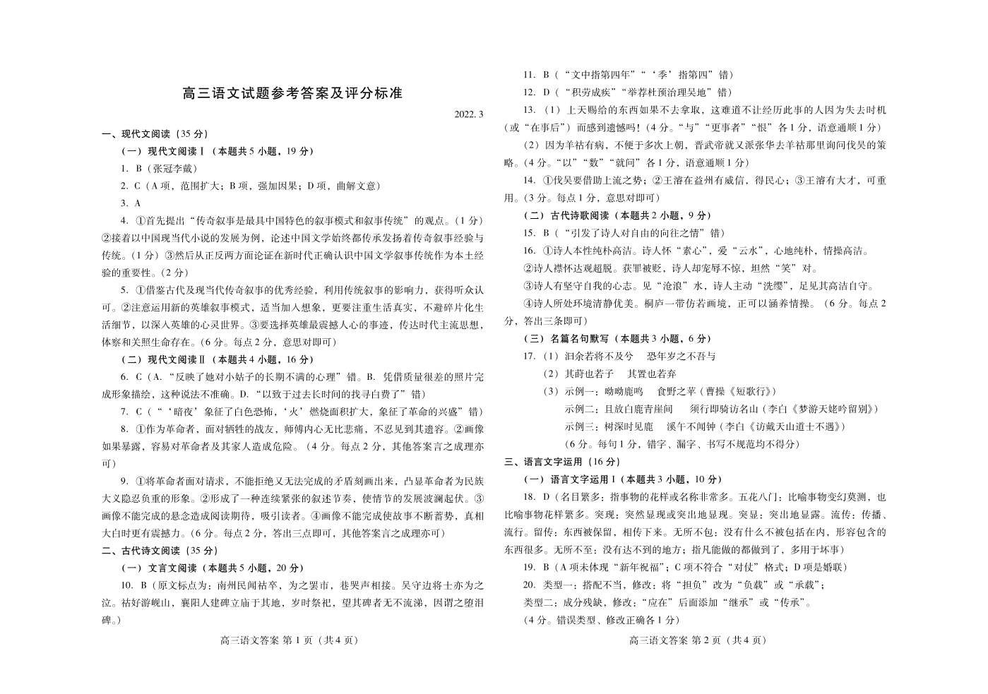 山东省潍坊市2022.3高三年级第一次模拟试题语文答案