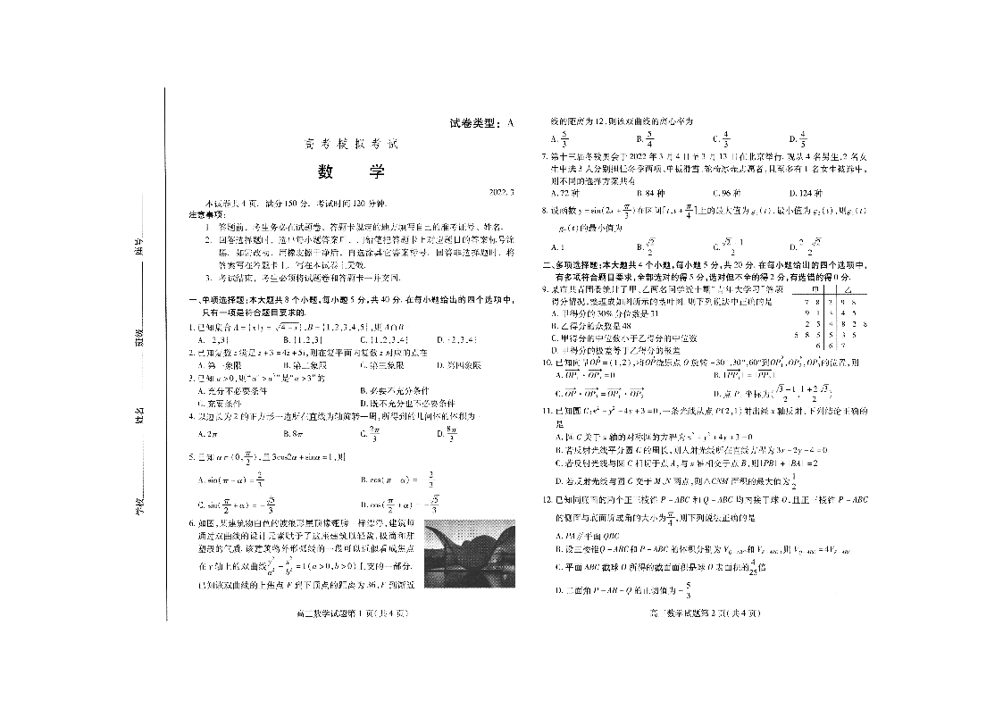 山东省潍坊市2022.3高三年级第一次模拟试题数学