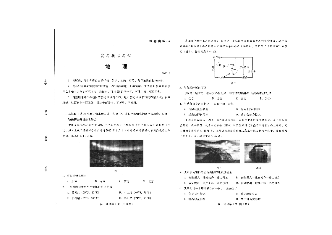 山东省潍坊市2022.3高三年级第一次模拟试题地理