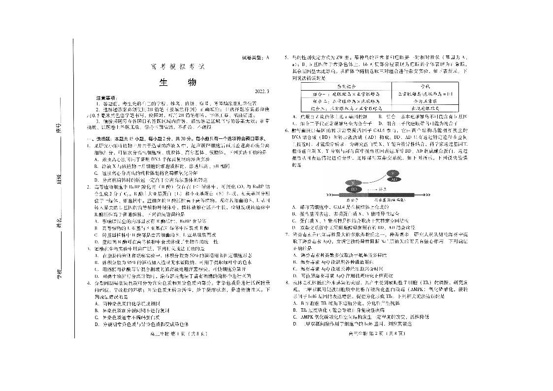 山东省潍坊市2022.3高三年级第一次模拟试题生物