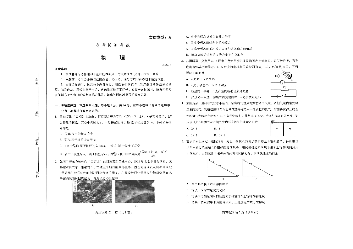 山东省潍坊市2022.3高三年级第一次模拟试题物理